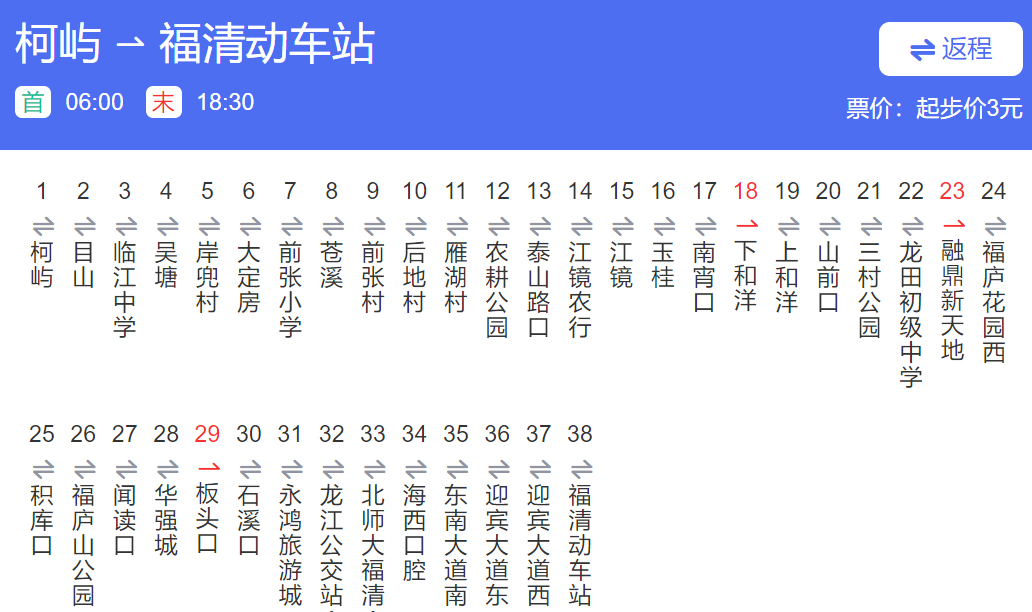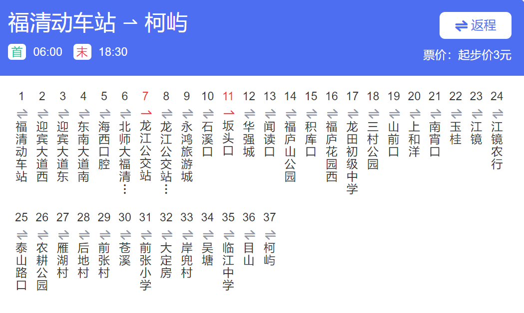福清805路公交车行车路线图 交通 22年9月8日 编辑 福清哥 取消关注 关注 私信 福清805路公交车行车路线图 运行时间:福清动车站06:00-18:30|吴塘06:00--18:30 参考票价:全程7元,分段计费 福清火车站—柯屿 柯屿—福清火车站