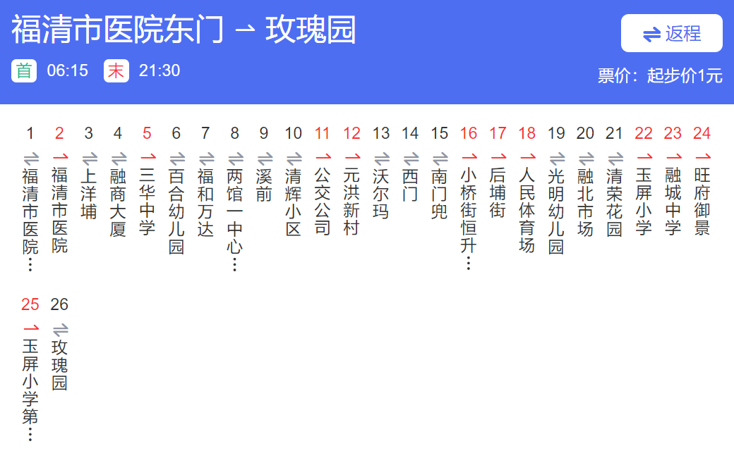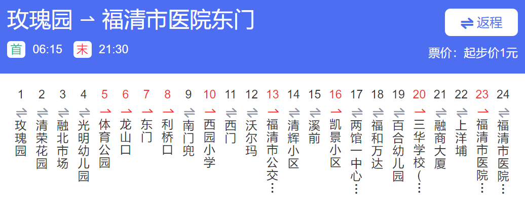 福清811路公交车行车路线图 交通 22年9月14日 编辑 福清哥 取消关注 关注 私信 福清811路公交车行车路线图 运行时间:福清市医院东门06:15-21:30,玫瑰园06:15-21:30 福清市医院东门—玫瑰园 玫瑰园—福清市医院东门