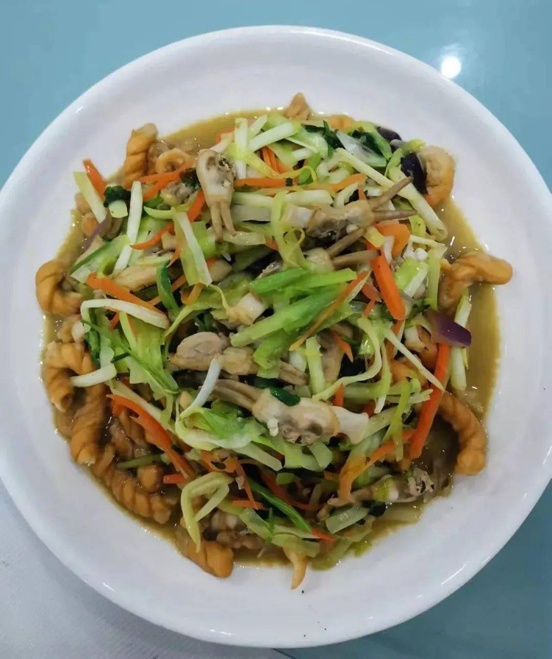 麻花炒蛏又名“火把”蛏,取新鲜活蛏,热水下锅焯至开壳,捞出去掉外壳,清洗干净备用。另起锅烧油,下生姜、洋葱、韭黄、胡萝卜、芹菜、葱白,翻炒断生后下海蛏、少量盐、蒸鱼豉油、味精,加少量热水煮30秒起锅,盘中事先放上麻花,出锅倒入海蛏覆其表面,以保证麻花在吸收蛏汤汁的同时,保留原有酥脆。