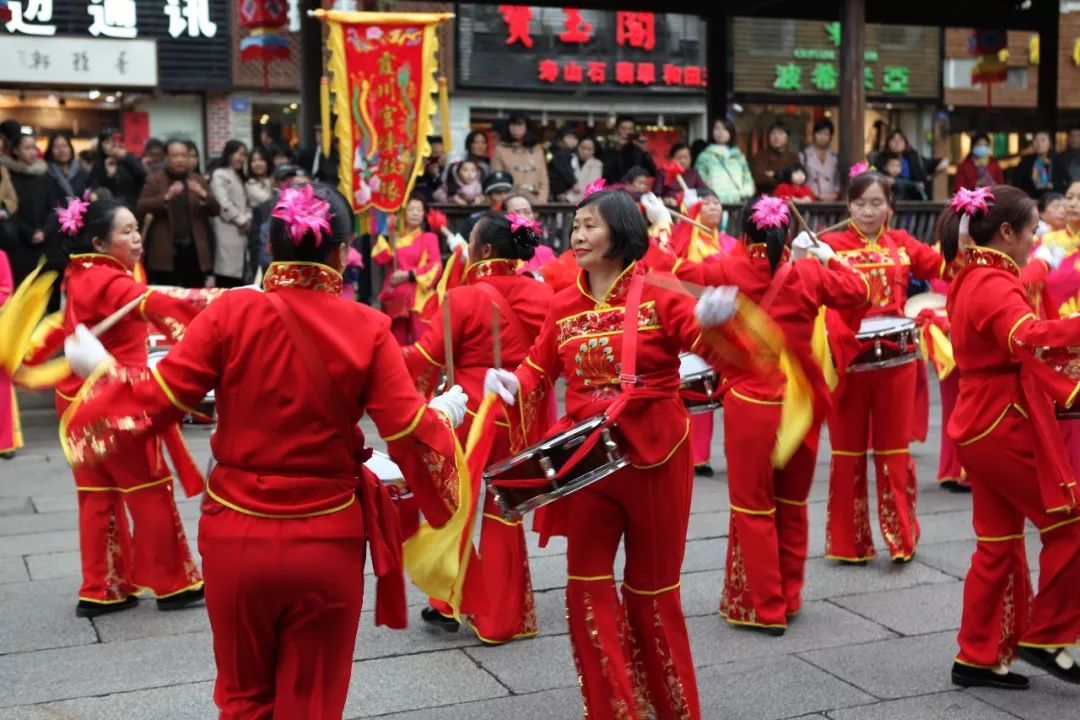 现代福清新厝伡鼓舞是由青壮年妇女组成,她们涂口红,描秀眉,头上簪大红组花,身着整齐服装,脚踏乡花软鞋,在鼓手的指挥下,钹手、锣手踩着或急如流星,或缓如淌水,或不急不缓,似行云流水般的舞步,且不断变换队形,在彩旗、凉伞中穿梭往来,如游鱼,似飞蝶,像翔鸟,把对美好生活的向往表现得淋漓尽致。