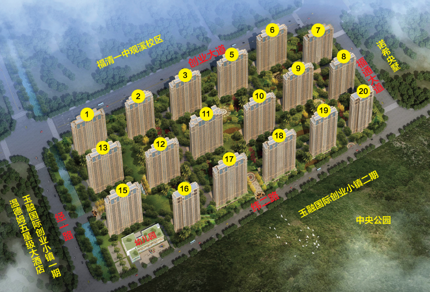 中联· 悦融庄项目东临福通大道,南靠纬二路(创业小镇二期及中央公园),西向经一路(温德姆大酒店及创业小镇一期),北邻东大路(一中观溪校区)。项目占地192亩,总建筑面积约42万㎡,规划了18栋高层纯商品房住宅。同时,中联·悦融庄是目前福清在售项目中少有的无安置型商品房社区。