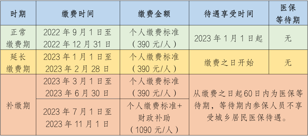 2023年度福州市城乡居民医保个人缴费标准为390元/人,财政补助700元/人。逾期参保缴费的城乡居民(新生儿除外),允许其参保缴费,从缴费之日起60日内为医保等待期,等待期过后再按规定享受相应的医疗保险待遇,缴费之前和等待期期间发生的医疗费用,医保基金不予支付。具体规定如下: