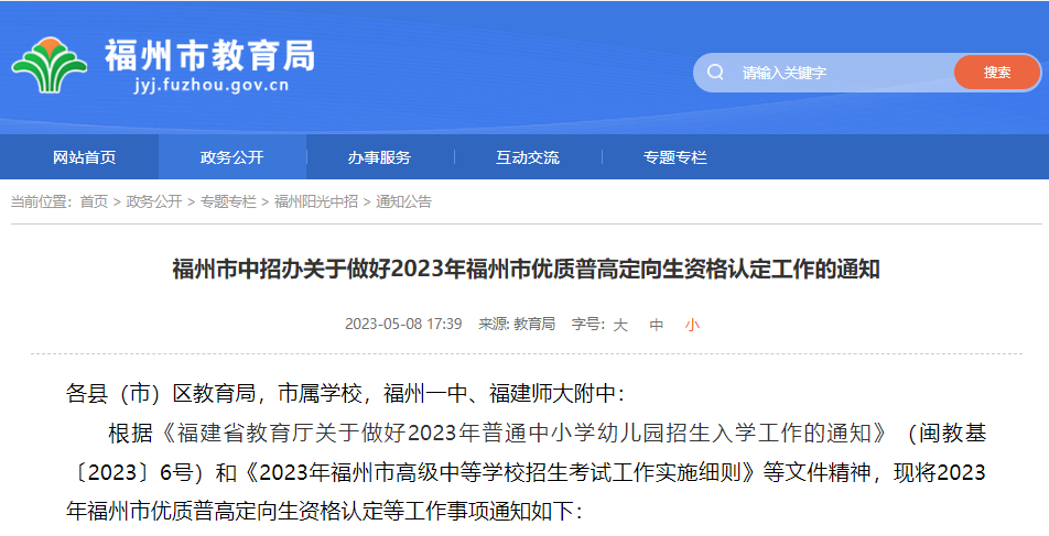 福州教育局网站发布《福州市中招办关于做好2023年福州市优质普高定向生资格认定工作的通知》