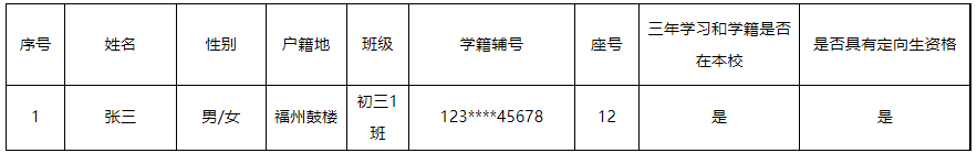 2.定向生名单公示:符合定向生资格的考生名单必须在中招系统、官网、学校和班级内公示。校内公示内容应包括学生姓名、性别、户籍地、班级、学籍辅号、座号、三年学习和学籍是否在本校、是否具有定向生资格等内容,参考格式如下: