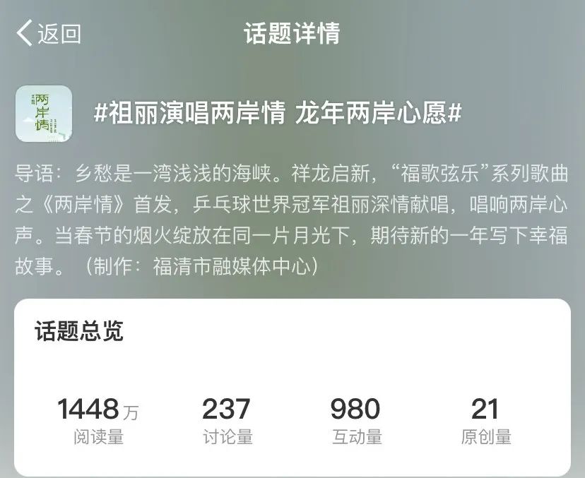 歌曲在新浪微博一经发布,福建发布、福建海博TV、海西晨报等大V纷纷转发,目前微博话题#祖丽演唱两岸情 龙年两岸心愿#阅读量已超过1448万。