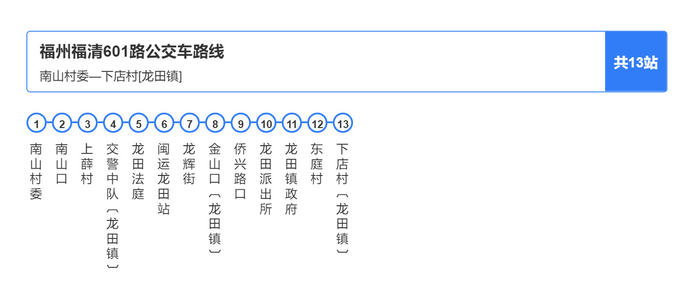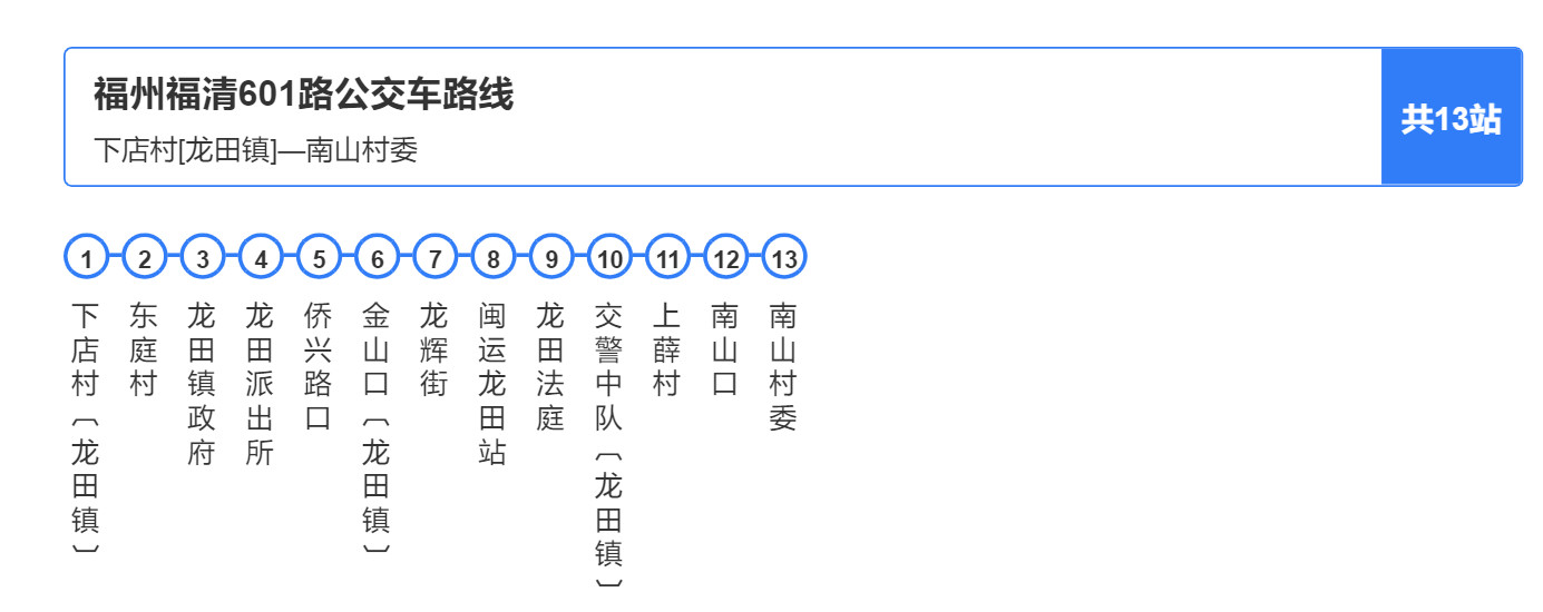 福清601路公交车行车路线图 交通 22年9月4日 编辑 福清哥 取消关注 关注 私信 福清601路公交车行车路线图 运行时间:南山村委06:20-18:00|下店村06:20-18:00 参考票价:票价2元 南山村委—下店村[龙田镇] 下店村[龙田镇]—南山村委